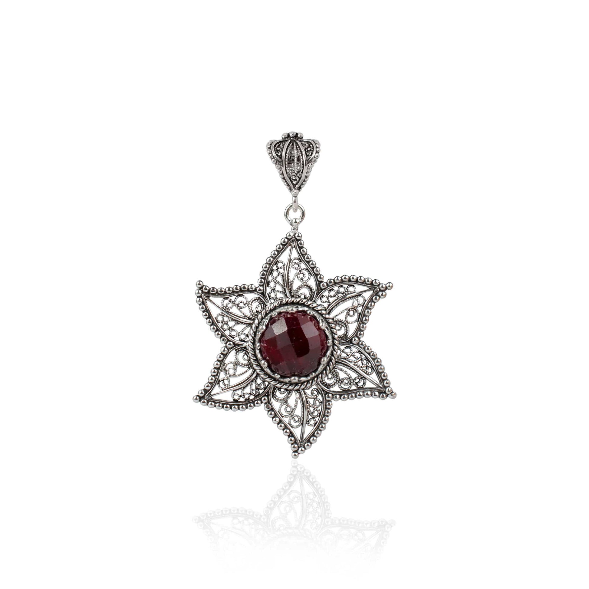 Filigree Art Ruby Corundum Gemstone Star Design Women Silver Pendant